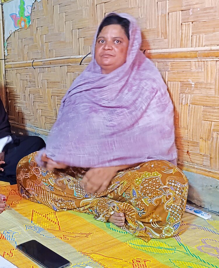 Eine DRK-Mitarbeiterin und eine Freiwillige vom Bangladeschischen Roten Halbmond sind zu Besuch gekommen und haben in der Strohhütte von Noors Familie auf dem Boden Platz genommen. Sie erkundigen sich nach den Erfahrungen der Frau, die mit ihren Angehörigen zur Minderheit der Rohingya gehört und deshalb nach Bangladesch fliehen musste.
