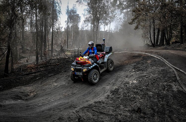 So wird das Gewicht von Patient und Gerät auf das Einrad verlagert, insgesamt ist man von der Spurbreite und von der Beweglichkeit her so flexibel, dass die Gebirgstrage auch auf schmalen Wanderwegen ihre Vorteile voll ausschöpfen kann.
