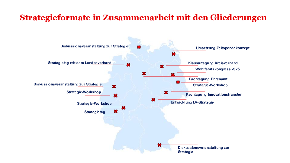 Die Umsetzung der DRK-Strategie 2030 gelingt nur gemeinsam unter Beteiligung aller engagierten haupt- und ehrenamtlichen Menschen im DRK. In Eigenverantwortung und entlang ihrer individuellen Gegebenheiten vor Ort setzen sich DRK-Verbandsgliederungen daher konkrete Ziele und entwickeln Maßnahmen und Projekte, die zum Erfolg der Strategie führen. Das DRK-Generalsekretariat begleitet diesen Prozess, fördert den Austausch, koordiniert und setzt Impulse. Dafür wurden in den vergangenen Jahren verschiedene Formate und fachliche Angebote entwickelt und etabliert.