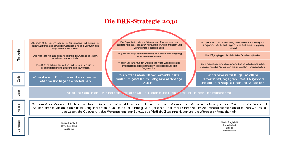 Nachhaltig sein, Wissen teilen und Strukturen so ausrichten, dass wir die Herausforderungen der Zukunft meistern können. Die DRK-Strategie 2030 hat es in sich, dabei sind das nur drei von insgesamt neun Teilzielen der Verbandsstrategie. Die DRK-Strategie 2030 wurde ab 2019 unter großer Beteiligung des gesamten DRK entwickelt. Seit 2022 setzen wir die Strategie um.