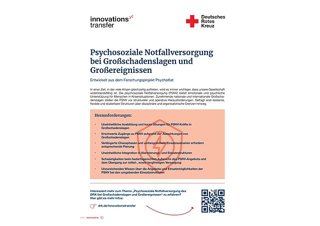 Standardisierte und wissenschaftlich fundierte Dokumentation ist ein Werkzeug, um in Krisenzeiten effektiv und nachhaltig zu handeln. Im Rahmen des Forschungsprojekts PsychoKat wurden innovative Ansätze zur Qualitätssicherung und Wissensweitergabe entwickelt, um die Psychosoziale Notfallversorgung (PSNV) gezielt zu stärken. Auf dieser Seite stehen die PSNV im DRK und die zentrale Rolle einer standardisierten Einsatzdokumentation im Fokus.