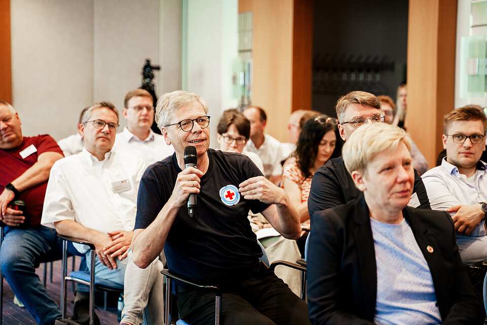 Zur diesjährigen Fachtagung Innovationstransfer (FIT) kamen über 80 engagierte DRK'lerinnen und DRK'ler aus ganz unterschiedlichen Ebenen, Gliederungen und Tätigkeitsfeldern in Leipzig zusammen. Unter dem Motto „Starke Strukturen für starke Hilfe“ stand die Modernisierung des Komplexen Hilfeleistungssystems (KHS) im Zentrum. Diese Erneuerung ist ein wichtiger Bestandteil eines Verbandsentwicklungsprozesses, den das DRK derzeit durchführt. Wertvolle Impulse für diesen Prozess sowie zu den Themen Transformation und Organisationsentwicklung im Kontext Bevölkerungsschutz kamen auch von externen Expertinnen und Experten.