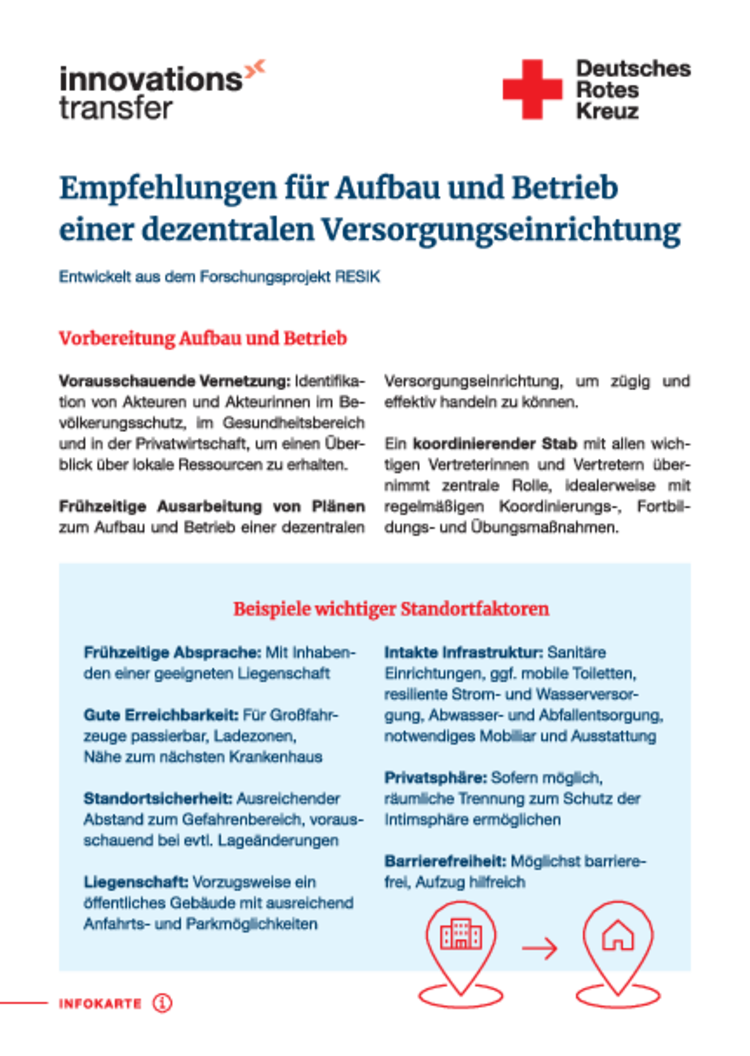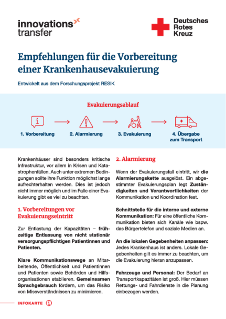 Entwickelt werden anwendungsorientierte Konzepte für eine effektive Zusammenarbeit von Behörden und Organisationen mit Sicherheitsaufgaben (BOS) mit Strukturen der Gesundheitsversorgung sowie weiteren relevanten Akteuren aus der Zivilgesellschaft. Der Schwerpunkt liegt dabei auf einer erforderlichen Härtung der Krankenhausstrukturen sowie auf der Sicherstellung der dezentralen Versorgung evakuierter Krankenhauspatientinnen und -patienten. Das Projekt RESIK baut dabei auf Erkenntnissen zum sozialraumorientierten Bevölkerungsschutz auf, der Kernthema der DRK Forschung ist.