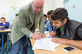 Auch internationale Rotkreuz-Helfer – etwa aus Kanada Norwegen, den USA und der Schweiz – engagieren sich inzwischen in Deutschland und unterstützen ihre einheimischen Kollegen in Flüchtlingsunterkünften. Rachelle Cardes aus Kanada ist eine Spezialistin für psychologische Hilfe und war bereits in Afghanistan und Pakistan tätig. Über ihren Einsatz in der Flüchtlingsunterkunft in der Gäubodenkaserne bei Straubing berichtet sie im Bayrischen Rundfunk: "Gerade Jugendliche, die allein unterwegs sind, oder Frauen allein mit Kindern, das sind die Gruppen, die besonders verwundbar sind. Wir geben ihnen so viel Unterstützung wie möglich und helfen ihnen bei der Ankunft in Deutschland." Die Arbeit ihrer deutschen Kollegen schätzt die junge Kanadierin: "Sie tun, was sie können und [...] das ist fantastisch." Drei junge Syrer wurden im bayrischen Feldkirchen selbst zu Helfern: Die Brüder Ziad (21) und Alhajjar (16) sowie ihr langjähriger Freund Sheri (18) aus Damaskus sind in der Notaufnahme für Flüchtlinge kurzerhand als Dolmetscher eingesprungen und haben so wertvolle Hilfe zur Verständigung geleistet. Vor ihrer Flucht haben sie in ihrer Heimat Telekommunikation (Ziad) und Elektrotechnik (Sheri) studiert.
