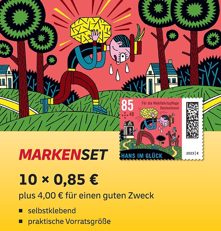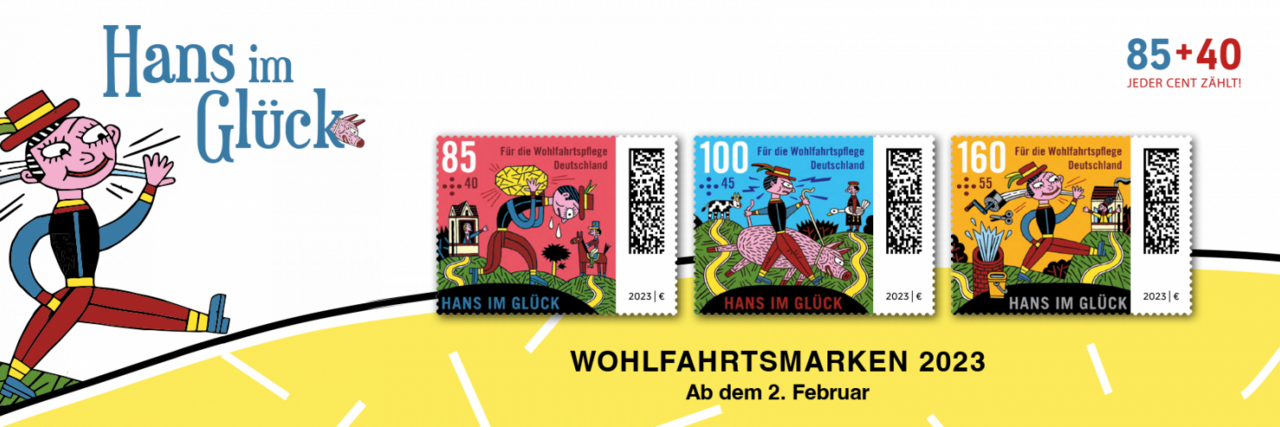 Im Jahr 2023 sind Motive aus der Geschichte „Hans im Glück“ Thema der Sondermarkenserie „Grimms Märchen“. Das Grimm’sche Märchen handelt von einem, der den reichen Lohn seiner Arbeit immer weiter eintauscht, bis er am Ende nichts mehr besitzt. Obwohl er bei seinen Tauschgeschäften jedes Mal „über’s Ohr gehauen“ wird und schließlich mit leeren Taschen heimkehrt, tut er dies voller Glück und Zufriedenheit.