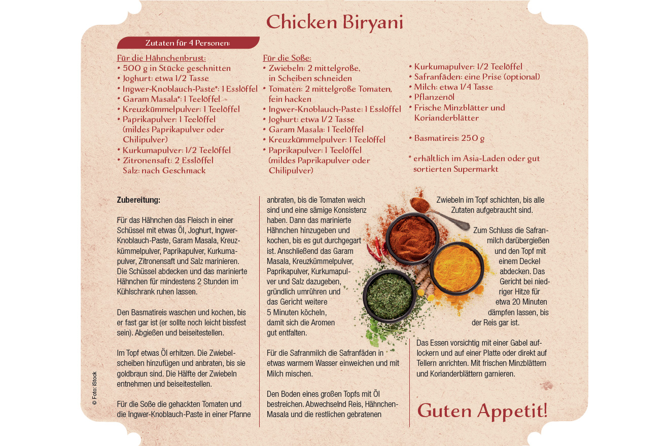 Eines seiner Lieblingsgerichte ist übrigens Chicken Biryani, ein Festessen, das in Indien traditionell in großen Runden geteilt wird. Das Rezept zum Nachkochen finden Sie hier (Bild vergrößert sich durch Anklicken). Viel Freude beim Essen und Teilen.