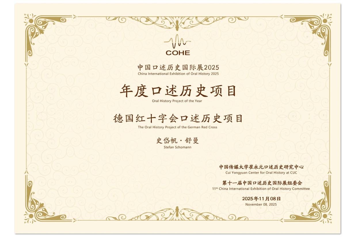 Am 8. November 2025 hatte das DRK Gelegenheit, seine Zeitzeugenarbeit in Peking zu präsentieren. Chinas dortige Medienuniversität (中国传媒大学) verfügt über ein eigenes Institut für mündliche Überlieferung. Es trägt den Namen seines Gründers Cui Yongyuan und dient als Forschungsstelle und Archiv für Oral-History-Projekte in ganz China und darüber hinaus. Für seine alljährliche Konferenz und Ausstellung hatte es fünfzig Projekte ausgewählt, zehn davon wurden nun auf der abschließenden Gala ausführlich vorgestellt. Vor vierhundert Zuschauern gab Stefan Schomann einen Überblick über die seit 2016 laufende Zeitzeugenarbeit des DRK, berichtete über die dabei gesammelten Erfahrungen und stellte die daraus hervorgegangenen Publikationen vor.